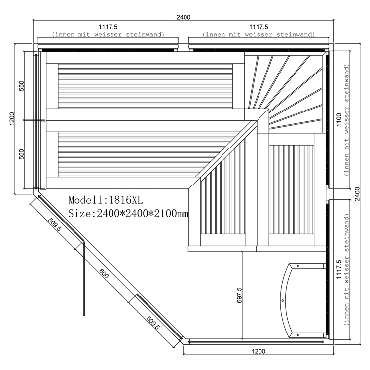 - 2400mm x 2400mm x 2100mm (Länge x Breite x Höhe)