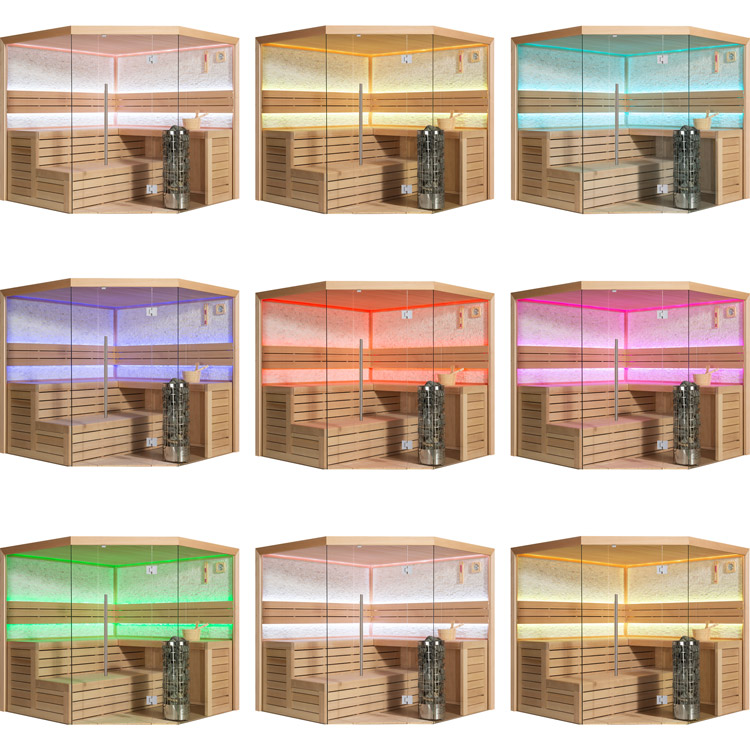 Das Highlight dieser Sauna ist die indirekte LED Beleuchtung. Sowohl die Decke, als auch die Rückwand wird durch viele kleine LED´s indirekt beleuchtet. Das Licht kann wahlweise sanft wechseln, oder auf einer Farbe stehen bleiben. Relaxen Sie in dieser Wohlfühlatmosphäre, oder genießen Sie einen wohltuenden Aufguss. Mit einer AWT Sauna holen Sie sich Ihre persönliche Wellnessoase ins eigenen Zuhause.