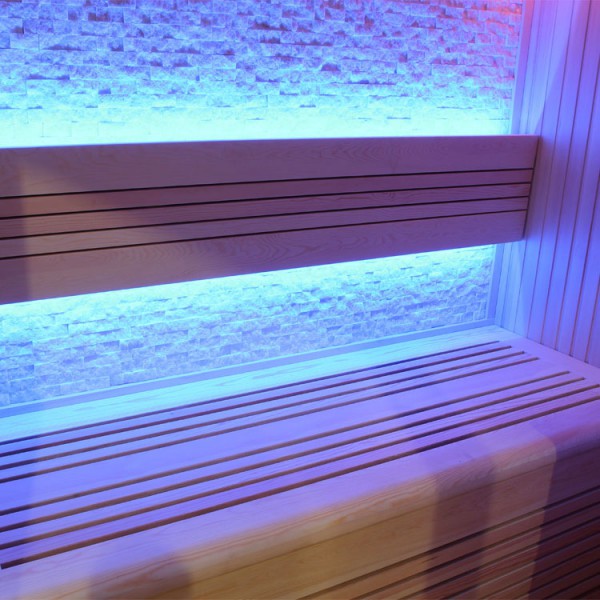 Einer der Highlights dieser AWT Sauna ist dieindirekte Beleuchtung mit LED. Die Rueckwaende und auch die Decke werden mit vielen kleinen LED beleuchtet (indirekt). Sie können das Licht so einstellen das es immer Sanft wechselt oder auch bei einer Farbe stehen bleibt. Relax Pur mit einer tollen Atmosphäre.